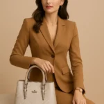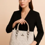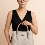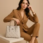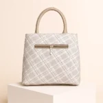 The Maple Silk is a structured beige handbag featuring a delicate plaid pattern that blends grace with intention. Its creamy undertone and sleek silver accents make it ideal for a woman who is both gentle in style and firm in presence.